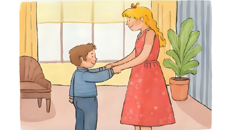 エレベーターで上に上がりました。そして、7歳くらいの赤いワンピースを着た女の子と、青い服を着た3歳くらいの男の子が笑ってそこにいました。