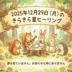 2025.12.29 今日のきらきら星ヒーリング 2025年12月29日(月)のきらきら星ヒーリング 川村 裕美 こんにちは。いつもブログにお越しくださりありがとうございます。 本日のきらきら星ヒーリングのお知らせです😃 2025年12月29日(月)のきらきら星ヒーリング 昨日は、祝詞、遠隔レイキ、お祓いをさせていただきました。 目を閉じても何も見えませんでしたし、夢も見ませんでした。 今日は特別お知らせはありません。 引き続き、よろしくお願いいたします。 いつもありがとうございます。 ABOUT ME ひろみセラピスト/ブロガーX精神世界を探求・研究し続けてきて21年。退行催眠のセラピスト。また、夢を見てメッセージを受け取ったり、夢を使ってヒーリングを行うこともしている。いつの間にかどこからともなく夢でメッセージが来るようになり、そのメッセージをこのブログで発信中。